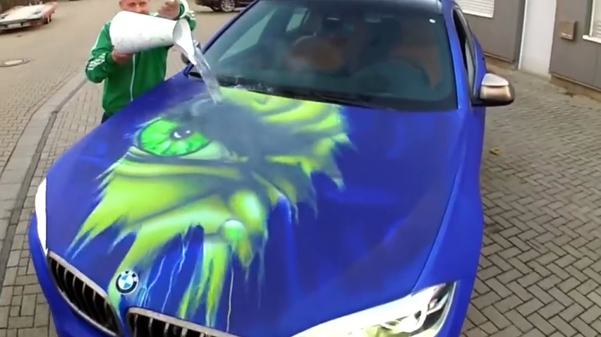 In Germany, the graffiti artist Rene Turrek converts a BMW car X6 from blue to green with the image of Hulk. For this purpose, the car is coated with a special paint which reacts to temperature change. When poured hot water onto stain, the BMW changes color and disclosed plans.