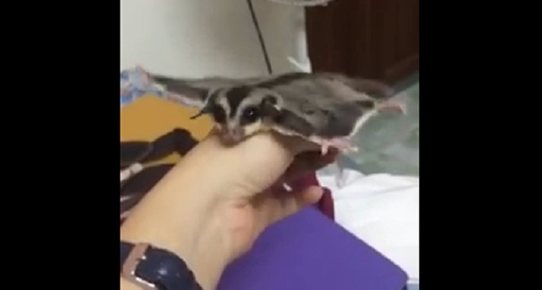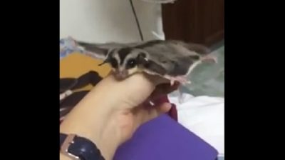A flying posoym is set on a human hand in front of a fan. Cute little marsupial uses the membranes of the skin when he feels the wind coming over it.