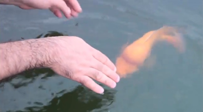This fish brings back the objects of flies a man, like a dog. The man in the video encourages and patting the fish, which is a kichlida of the genus Amphilophus citrinellus.