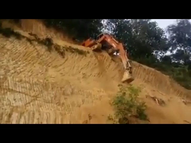 Excavator operator manages to take down the machine from a very steep hill, with impressive handling.