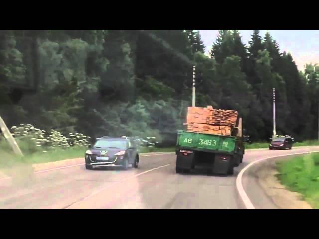 A truck carrying timber in Russia, has a problem with the balance of treiler.