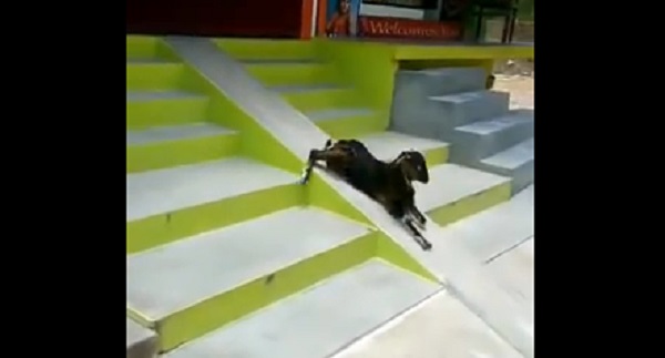 Somewhere in India, a goat amused by making a slide on a concrete ramp.