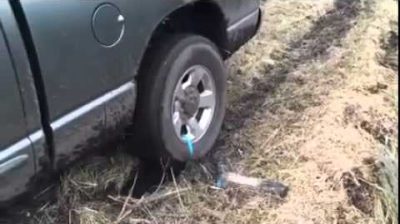 A Russian method to unstick your car out of the mud. A man tied a wood on the edge of the wheel of his car, that was stuck in the mud.