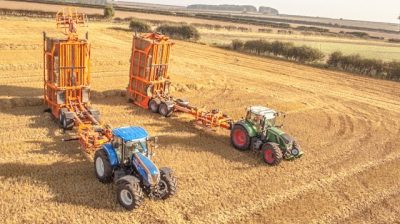 In this video, we see two 'stackers' of straw bales collecting the bales in a field of wheat, in Britain's Yorkshire. The aerial shots are quite impressive.