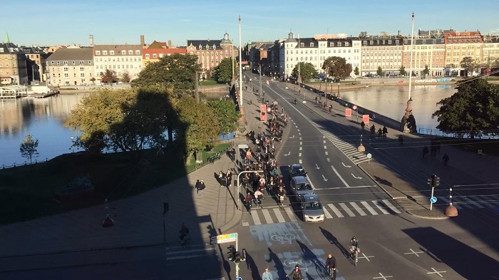 A camera records traffic on a Copenhagen road & bike path in the morning.