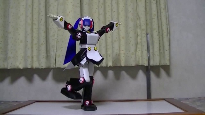 In Japan, a robot dances particularly well to the song “Heavy Rotation” by the female J-Pop group AKB48. This robot is improvised and constructed from a Japanese under the pseudonym of Dr. WEAR. It is 52 cm in height and has 27 points of articulation (Six on each foot, 6 in each bracket 3 and the head).