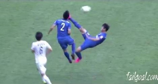 The player Li Jianbin in match between Shanghai Shenhua and Changchun Yatai in China, He tried to banish the ball with inverted scissors, but all they managed was to hit teammate Xiong Fei, who fell unconscious. Fortunately, the Fei met after a while and had no further problem.