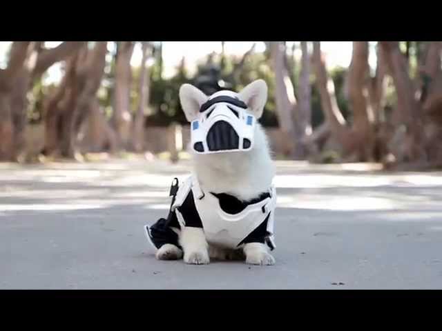 The owner of Winston, a white korgki, had the idea to build a Stormtrooper costume for this Halloween.