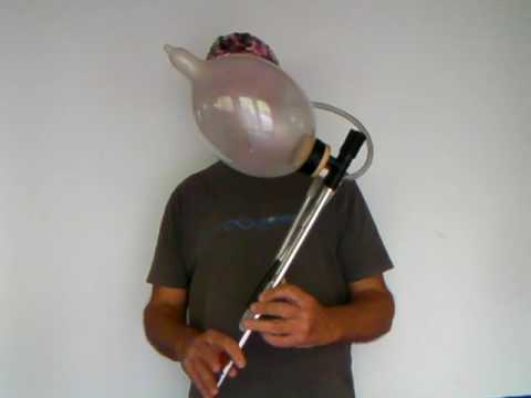 The musician Linseϊ Pollack, use two condoms (one inside the other) to create the bag for this improvised bagpipe. The body is made of aluminium tubes.