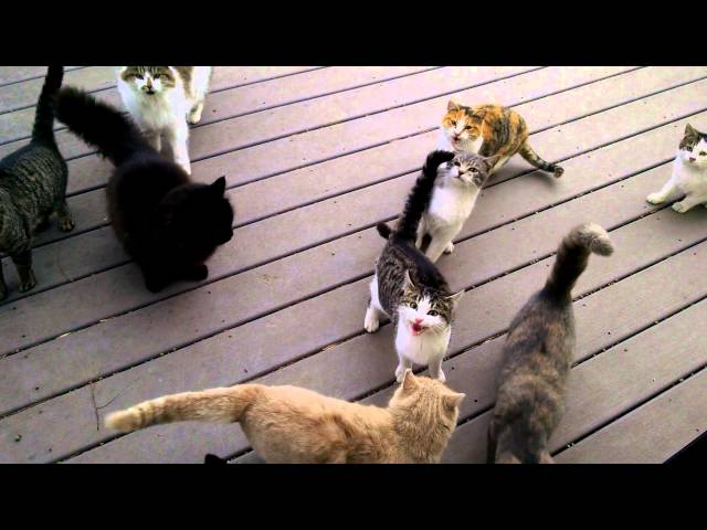 11 cats waiting eagerly eating from their owner, on a farm. The owner who is a farmer and uses cats to exempt from rodents, says that this happens every day at the same time just outside the door of the.
