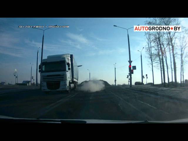 On a city street in Grodno Belarus, a large piece of ice onto the trailer of a truck causes an unusual accident.