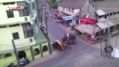 Elephants are usually calm animals, but better not to be on their way if upset. An elephant in Kerala state of India for unknown reason becomes aggressive, destroying a tricycle vehicle and then several shops. The driver of the elephant who was on his back at that time, trying in every way to descend from the animal.