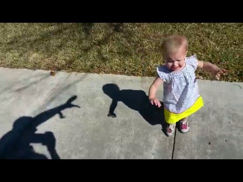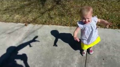 A father scares the little daughter doing stunts with his shadow on the ground.