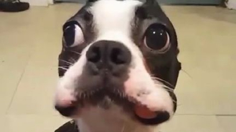 The Basil, a dog Boston Terrier, trying to hide a carrot in his mouth.
