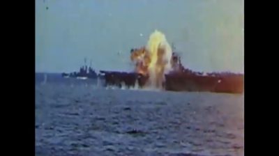 Rare color video with Japanese kamikaze attacks on American ships, during the Battle of Leyte Gulf in the Philippines in October 1944.