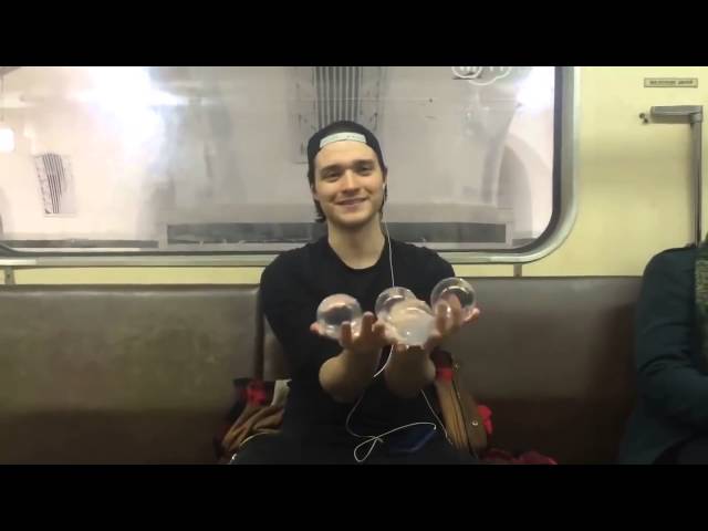 In Moscow metro, a young man makes a show of impressive skills in contact juggling crystal balls.