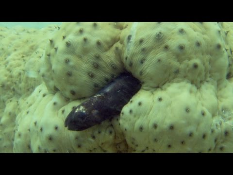 A cunning pearl fish finds a rather unusual safe haven in the rear end of a sea cucumber.