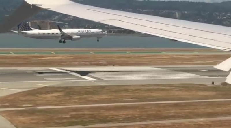 Two airplanes landing at San Francisco International Airport.
