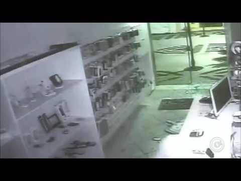 A robbery rummages through store and on his exit, he face plants his head into the glass door, falling backwards. He escapes.