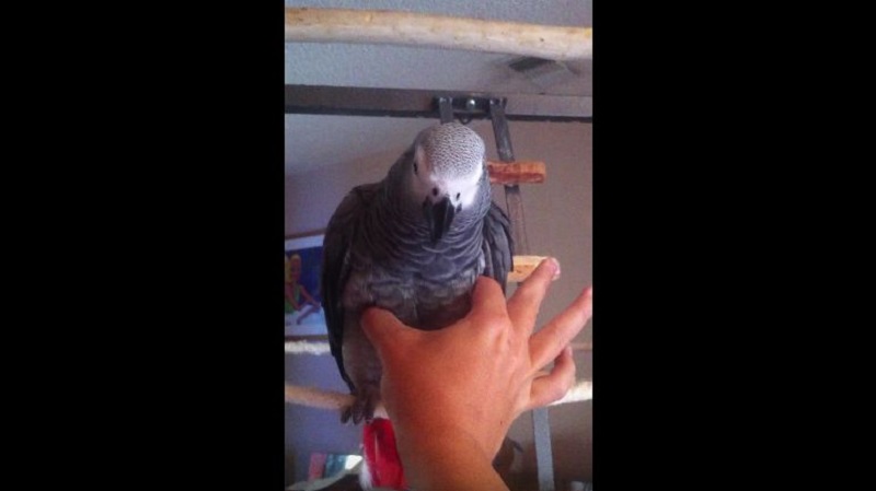 The Kanji Parrot imitates the sound of a rubber game for dogs, When the owner of the, pushing his body with fingers.
