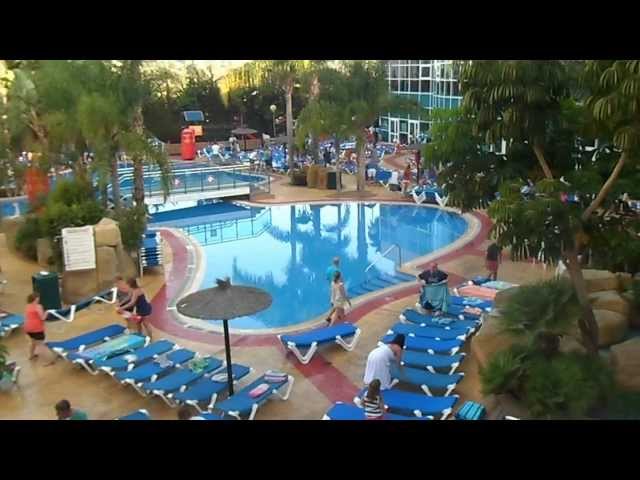British tourists rushing to catch the best places in the pool of the hotel Medplaya Hotel Flamingo Oasis in Benidorm, Spain. When it comes time, the tourists are running on a sun lounger and quickly put their towels on the ground to catch a place as close as possible to the pool. In a few minutes, the space is full.