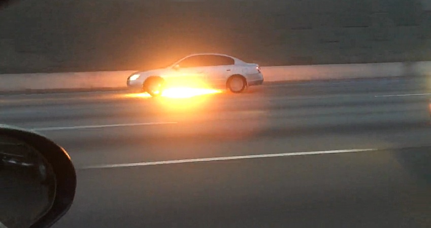 Situated in Buckhead Atlanta, a motorist registers a fire car gearbox. pieces of metal fall on the road, while the driver of the car does not seem to understand what has happened. After a while the car stopped without causing an accident. The lights began when gear oil leaked out of the box on the catalyst causing ignition.