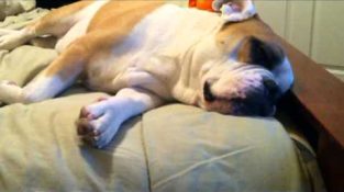 A very cute video of a Grandpa trying to sleep to an English bulldog.