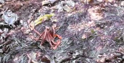 An Octopus out of the water, leaves a crab and leaves. Protest against economic crisis;