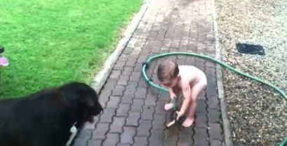 Give a baby a hose with water and two Labrador, and will be permanently happy