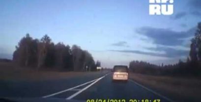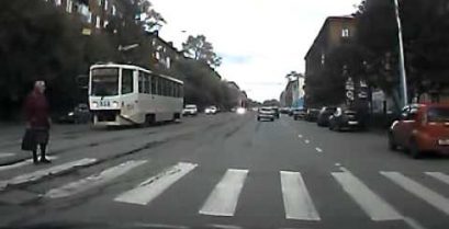 A guide to Russia emerges from his car and help a grandmother to cross the road