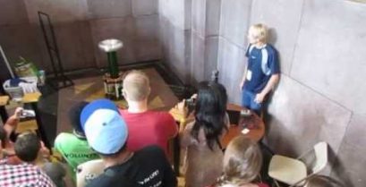 A Tesla coil shaped headphones playing the melody from the track 'Sail' Awolnation, scientific report Maker Faire 2013, in Kansas.