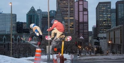 Snowboarding in Montreal of Canada on a nice advertisement of O'Neill