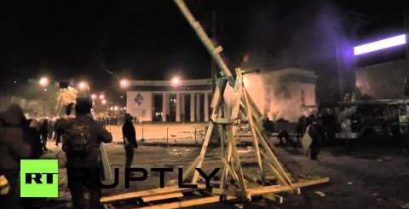 The protesters in Kiev using a makeshift catapult constructed, to hail stones and firecrackers at police.