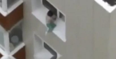 Scary videos from India, with a baby actually somewhere between life and death at the edge of a window 9orofis building.