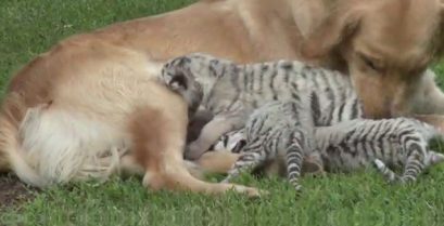 Isabella, a dog breed Golden Retrievers was recently for the first time mom, having adopted three newborn white tigrakia after ejecting from their mother at the Safari Zoological Park of Kansas.
