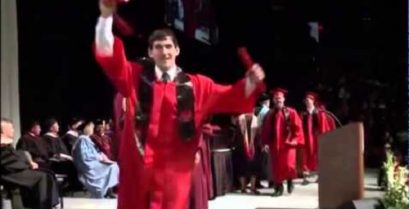 A University graduate in Michigan is trying to do a reverse somersault when he receives his degree. He should have trained better…