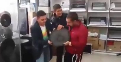 In Turkey, three men are trying to keep a car subwoofer currently playing music. The bass in the piece is so strong that I find it difficult to keep stable.