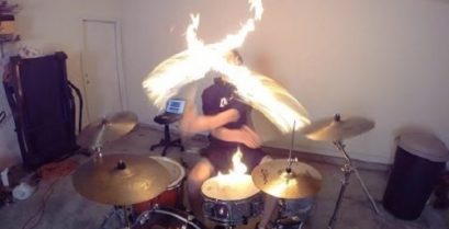 Casey Cooper performs Ellie Goulding's 'Burn' on drums, with flaming baguettes.
