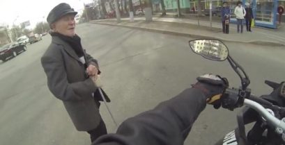 In Russia, a motorcyclist observes an elderly who finds it difficult to cross the road. Stop motion and protects him with his motorcycle until you pass across.
