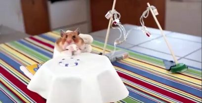 A chef prepares tiny hot dog and a tiny restaurant for the hamster.