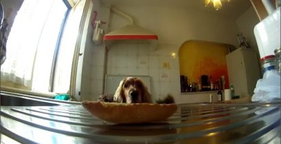 Joe the Cocker, trying to steal bread stealthily left his boss in the kitchen.