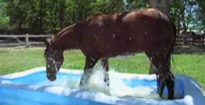 The Duke, a young horse, just discovered the childrens pool and play with the water.