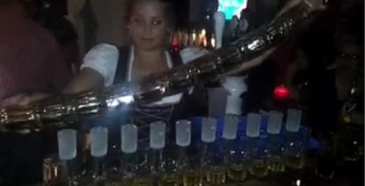 The technique of a very experienced barmaid currently serving ten shots Jägerbombs at bar Heidis Bier Bar, in Copenhagen, Denmark.