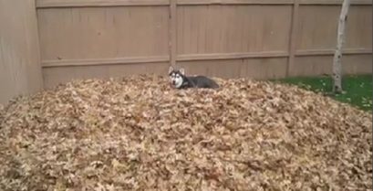 A happy Husky enjoying the game in a large pile of dry leaves.