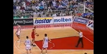 The journalist Alekos Theofilopoulos makes a funny comment about the referee in the small final of EuroBasket 1995 (Greece – Croatia).