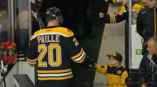 Watch as a young little fan fist bumps the Boston Bruins players after their pregame warm up.