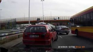 In the street of Warsaw in Poland, a driver trying to change lanes, but the stubborn lying there won't let him. Eventually the second car will end up… on top of the first.