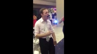 A drunken man tries to sing at a party. With so much alcohol, will surely thinks is the best singer in the world.