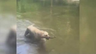 After he caught the wood, a Labrador comes from the river. Wanting to dry his body, will make a spectacular trick.