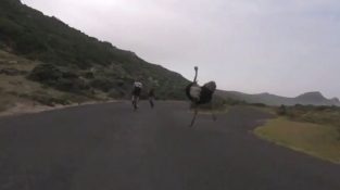 While touring with their bikes on a small road in Africa, two bikers from an ostrich for several hundred meters. A scene that looks like the dinosaur hunt in “Jurassic Park”.